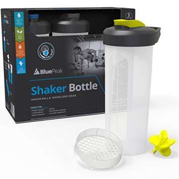 BluePeak Protein Shaker Bottle 28 oz with Dual Mixing Technology, Strong Loop Top, BPA Free, Shaker Balls & Mixing Grids Included - On-The-Go Large Protein Shakers (3 Pack - Yellow, Blue, Black)