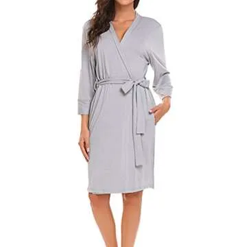Show moreIntroduce yourself to the ultimate blend of comfort and style with the Bluetime Women's Soft Kimono Robe. Crafted to redefine relaxation, this short bathrobe offers an exquisite feel with its lightweight and flowy design, making it perfect for lounging at home or adding a stylish touch to your maternity wardrobe. The unique blend of 95% cotton and 5% spandex ensures that you experience softness and stretch, allowing for easy movement while ensuring you stay comfortable throughout the day. The alluring Teal Green color resembles a Robin's egg blue, adding a pop of color to your sleepwear collection while enhancing your natural beauty.