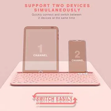 Show more The perfect accessory for the modern tech-savvy user, this ultra-portable keyboard combines style and functionality like no other. Its sleek design is accompanied by a vibrant pink color that adds a touch of flair to any workspace or study area. This Bluetooth keyboard not only connects seamlessly with two devices at once but also allows for quick toggling between them, making it ideal for multitaskers on the go.