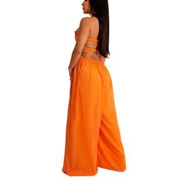 Show more Step into style and comfort with the Bluewolfsea Women's Summer Sexy Halter Backless One Piece Flowy Chiffon Wide Leg Pants Rompers. Crafted from a lightweight blend of polyester and spandex, this romper is not just a piece of clothing but a reflection of summer elegance. The halter neckline highlights your shoulders beautifully, while the backless design adds an enticing twist, making it perfect for those warm, sunny days at the beach or elegant nights out. With its flowy wide-leg pant style, you'll experience freedom of movement whilst looking effortlessly chic. Plus, the inclusion of pockets adds a touch of practicality to your fashionable ensemble. Available in a vibrant orange, this jumpsuit is bound to make you stand out in any crowd.