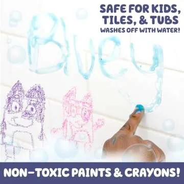 Show more Transform bath time into a world of creativity and fun with the amazing 9-Piece Bath Play Set featuring your favorite characters, Bluey and Bingo! This delightful set encourages imaginative play with its vibrant and eco-friendly bath crayons and paints. Every piece is designed to inspire artistic expression while ensuring safe play, making it the ultimate addition to your child’s bath time routine. With 3 dissolvable bath paints in vivid colors and crayon holders that keep mess to a minimum, this set promotes a hassle-free cleanup for parents and endless joy for kids.