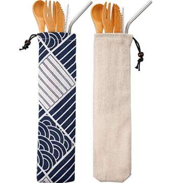 Blulu 2 Set Bamboo Cutlery Set Reusable Bamboo Flatware Set Travel Utensils 7.5 Inches Bamboo Knife, Fork, Spoon, Metal Straw with Clean Brush (Style A)