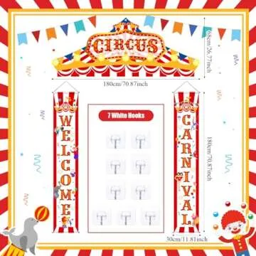 Show moreIf you’re looking to add a splash of color and excitement to your next event, look no further than the Blulu 3 Pcs Carnival Circus Porch Banner Decorations. This delightful Circus Party Awning Hanging Banner Set includes an irresistibly vibrant collection of pieces designed to bring the magic of the carnival right to your doorstep. With one large circus awning banner measuring approximately 71 x 26.8 inches and two charming door banners at 71 x 11.8 inches each, you’ll be fully equipped to create an unforgettable atmosphere that captivates guests of all ages!