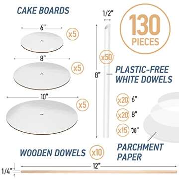 Designed with convenience in mind, this cake kit comes with pre-cut parchment paper rounds that are not only oven-safe but also feature a nonstick coating. Available in the same sizes as the boards, these parchment rounds make baking and serving uncomplicated. With long 12-inch wooden dowels included, measuring a solid 0.25" in diameter, and compatible with the pre-cut holes in our cake boards, stacking your cake has never been easier. For an extra boost of support, we’ve included 50 easy-to-cut straw dowels—a plastic-free alternative that enhances stability without the environmental impact.