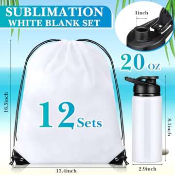 Show more Introducing the ultimate crafting duo that sparks creativity and adventure! Our package includes 12 pieces of sublimation aluminum water bottles and 12 pieces of matching sublimation drawstring bags, perfect for DIY enthusiasts and active lifestyles alike. Each bottle, crafted from lightweight aluminum, measures approximately 2.9 x 8.1 inches and holds about 20oz of your favorite beverage, making it ideal for hydration on-the-go. Whether at the gym, during outdoor activities, or just running errands, you can always stay refreshed.