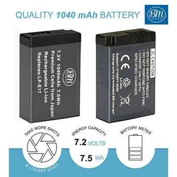 Show more Introducing the LPE17 Li-ion Rechargeable Battery, a game-changer for photography enthusiasts using Canon cameras. This high-capacity battery is designed to be fully compatible with a variety of Canon models including EOS R8, R10, R50, R100, and even the Rebel series like T6i, T7i, and more. With an impressive energy storage capacity of 1040mAh and operating at 7.2 volts, it ensures you have ample power for extended shoots without interruption.