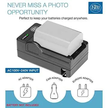 Compared to other battery chargers on the market, the BM Premium NP-FZ100 stands out for its compact size, universal charging capabilities, and bonus travel accessories. While many chargers restrict usage to certain regions, this charger allows for operation worldwide and includes a car adapter, aiming to meet the needs of the on-the-go user efficiently. Furthermore, the included one-year warranty offers users peace of mind that is often lacking with competing products.
