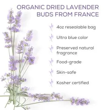 Show more Discover the delicate beauty and versatility of bMAKER Dried Lavender Flowers, meticulously sourced and packaged to bring a touch of nature’s magic into your home. This 4-ounce pack of edible and kosher certified lavender buds opens up a world of culinary and aromatic possibilities. Whether you’re stirring up a soothing cup of lavender tea, preparing a refreshing lavender-infused syrup, or adding a floral touch to salads and smoothie bowls, these ultra-blue grade lavender buds elevate every dish with their unique flavor and fragrant aroma. Not only do they serve culinary delights, but they also boast a rich lavender color that makes them perfect for crafting stunning decorations or adding a soothing scent to your living space.