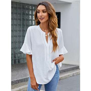 Show more Discover the perfect blend of elegance and comfort with our stunning white chiffon blouse. This beautiful piece is crafted from good quality chiffon fabric, making it lightweight, flowy, and supremely soft to wear. Designed with a small split V neck and ruffle sleeves that gracefully finish just above the elbow, it strikes the ideal balance between sexy and formal. Whether you're dressing up for a night out or keeping it casual, this top is versatile enough for any occasion.