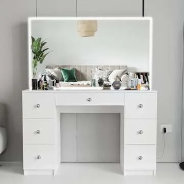 Boahaus Sabrina Modern Vanity Desk with Mirror and Lights, 7 Drawers, Large Standing Mirror, White Makeup Vanity, Bedroom Vanity with Mirror, LED Lights, Basic Knobs
