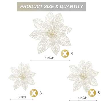 Boao 24 Pieces Christmas Poinsettia Tree Ornament Artificial Flowers Christmas Decoration Glitter Ornament, 3/4/6 Inches(White)