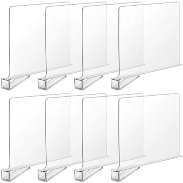 Show more Transform chaos into calm with the Boao 8 Pcs Shelf Dividers for Closet Organization. Designed to seamlessly blend into any closet, these clear acrylic dividers are your ultimate solution for achieving a neat and organized space. Each divider measures approximately 11.8 x 8 x 1.18 inches, perfectly sized to fit shelves with a thickness of 0.8 - 1.1 inches. Crafted from high-quality, durable acrylic, they feature round and smooth corners to prevent any damage to your shelves or clothing. Our dividers effectively help you stack items such as clothing, sweaters, linens, towels, and more into an easily accessible organized display. With a minimalistic design, they provide a visually appealing solution to clutter, making it simple to find what you need quickly.