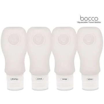 Show moreIntroducing the Bocco Leak Proof Squeezable Travel Bottles – your ultimate travel companion! Designed with the frequent traveler in mind, this set of four large (3 oz/89 ml) bottles comes in a NEW & IMPROVED Reusable Clear Zipper Bag, making it perfect for your next adventure. Bocco bottles are crafted from high-quality, soft silicone, ensuring easy squeezing without any hassle. Engineered to meet TSA regulations, these bottles are the ideal solution for carrying your favorite toiletries on flights without the worry of leaks.