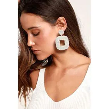 Boderier Beaded Drop Earrings Bohemian Beaded Square Hoop Dangle Statement Earrings (White)