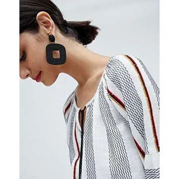 Boderier Beaded Hoop Earrings Bohemian Beaded Square Dangle Statement Earrings (Black)