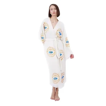 Show moreElevate your relaxation and style with the Bodho Handmade Evil Eye Boho Festival Kimono, a must-have piece designed meticulously from 100% organic cotton for those who seek both comfort and elegance. This robe not only features a captivating design that resonates with bohemian aesthetics but also prioritizes your comfort with its lightweight and breathable fabric, making it an ideal companion for warmer weather. Its unique OEKO-TEX Standard 100 certification ensures that the robe is free from harmful substances, allowing you to lounge with peace of mind.