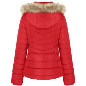 BodiLove Women's Fur Hooded Warm Winter Coat Quilted Puffer Jacket Wind Blocker Red