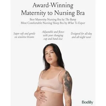 Show more Introducing the Bodily Everything Bra, an unparalleled solution for expecting and new mothers navigating the beautiful yet demanding journey of motherhood. This bra is not just any regular maternity wear; it combines luxury with practical features tailored specifically for pregnancy, nursing, and beyond. Crafted from eco-friendly OEKO-TEX certified fabric, this bra is soft to the touch and stretches effortlessly with your body, providing ultimate comfort and breathability all day and night. The innovative design responds to your changing cup and band sizes, accommodating your body as it evolves during pregnancy and postpartum.