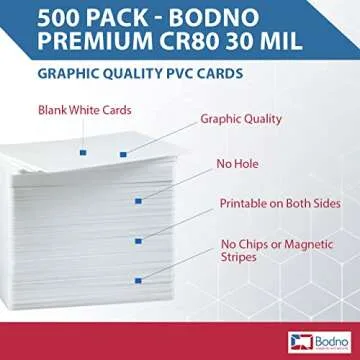 Show moreExperience unparalleled versatility with the **Bodno Premium CR80 30 Mil Graphic Quality PVC Cards**, meticulously crafted to cater to your professional and creative needs. Each pack contains **500 durable cards**, conveniently organized in **5 packs of 100**, ensuring that you have an ample supply for all your projects. With a **30 mil thickness**, these cards are identical in size and feel to a standard credit card, offering the strength and reliability you demand. Designed for utmost convenience, they are blank without any magnetic strips or perforations, allowing you to customize them fully for your unique branding or personal projects.
