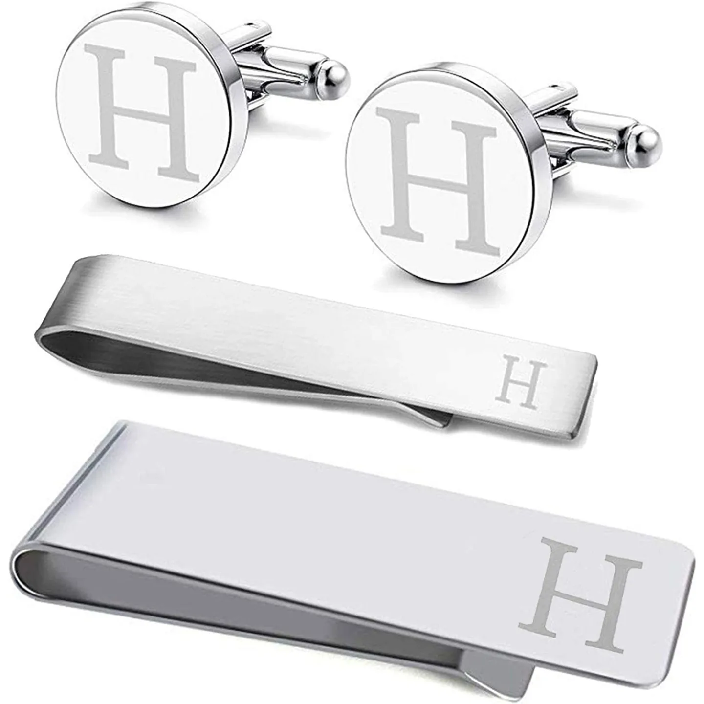 Show moreIntroducing the ultimate in personalized men's jewelry gift sets – the 4 Piece Set of Personalized Modern Style Men's Jewelry. This elegant and minimalist set includes a pair of cufflinks, a matching tie bar, and a money clip, all engraved with a stylish letter. Perfect for a wide range of special occasions, this set is beautifully designed to complement any suit, whether formal or casual. Each piece boasts a high-polished, reflective surface, creating a sophisticated and luxurious look. Packaged in a black gift box with a high-quality foam insert that securely holds each piece, this set is as practical as it is stunning. Proudly designed in the USA, we adhere to strict quality control measures to ensure every detail is flawless. Your satisfaction is guaranteed with a 90-day money-back assurance. Make a bold fashion statement with this exquisite jewelry set that's perfect for weddings, birthdays, graduations, and more!