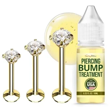 Show moreDiscover the ultimate solution for piercing care and style with our premium Bump Treatment and Jewelry Set. This expertly designed product helps to reduce the size, redness, hardness, and overall appearance of pesky piercing bumps, which can often be a source of frustration for those with both new and old piercings. With a unique formulation that promotes healing, this treatment actively targets unattractive keloids that might develop at entrance and exit sites. Experience a transformative healing process, as our formula works diligently to minimize elevated scars and bumps, giving you the confidence you deserve.
