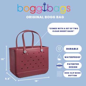 Show moreMeet the BOGG BAG - Original, Extra Large Tote Bag, a revolutionary accessory that seamlessly merges style and functionality! Measuring a generous 19 x 15 x 9.5 inches, this tote is not only light in weight but also big in personality, making it the ultimate companion for those endless summer days. Whether you're heading to the beach, pool, or simply out for a day of shopping, the Original Bogg Bag is designed to accommodate all your essentials, from snacks and suntan lotion to books and makeup. Crafted with love and innovation, this patented tote bag is Mom Invented, Family Designed, and Award Winning, providing a touch of joy and practicality that families around the world trust for their adventures.