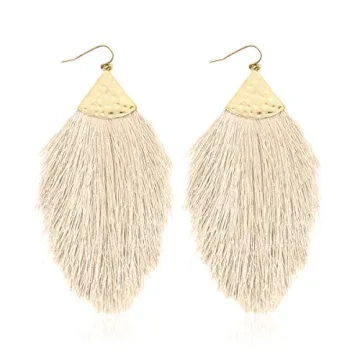 Bohemian Silky Thread Fan Fringe Tassel Statement Earrings - Lightweight Strand Feather Shape Dangles (Feather Fringe - White)