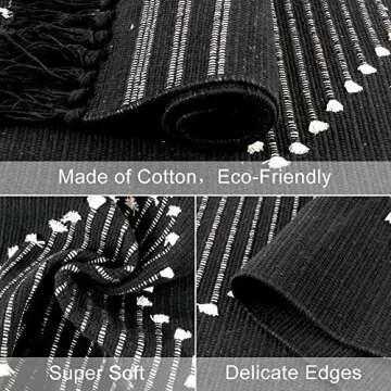 Show more Introducing the Boho Kitchen Rugs, an exquisite blend of modern design and practical functionality. Measuring 2'x4.3', this washable black bathroom rug runner boasts a striking diamond pattern, accentuated by beautiful tassels that bring a touch of elegance to any space. Made from soft cotton, this indoor mat provides a luxurious feel underfoot, ensuring your feet remain warm and cozy whether you're standing in front of the sink in your kitchen or enhancing the aesthetics of your bathroom. Its contemporary bohemian vibe not only elevates your decor but also enhances your overall home atmosphere.