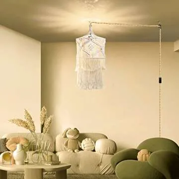 Boho Plug in Pendant Light, 15FT Hanging Lights with Plug in Cord, Pendant Lights with Handmade Macrame Lamp Shade, Hemp Rope Cord and On/Off Switch, Hanging Lamp for Boho Bedroom Decor Living Room