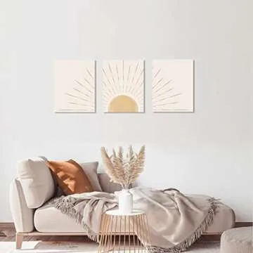 Show moreIntroducing the exquisite Boho Wall Art Set of 3 featuring captivating geometric illustrations of a sun rising on the horizon. This stunning collection brings a warm touch to your home decor, designed to enhance any space with its modern and bohemian elements. Measuring 12x16 inches each, these framed canvas prints are perfect for any area, whether it be your living room, bedroom, nursery, or office. Crafted with care, they effortlessly blend elegance and uniqueness, allowing you to enjoy their beauty every day. The clean lines and warm yellow colors illustrate a peaceful sunrise, creating a serene atmosphere in your home.