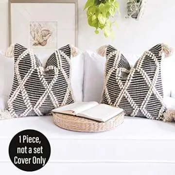 Indulge in the ultimate home decor upgrade with our Boho Woven Pillow Cover. This exquisite black throw pillow cover merges bohemian aesthetics with practical functionality. Measuring 18x18 inches, this stylish cover is made from high-quality materials, ensuring durability and comfort. The stunning woven fabric features intricate patterns and charming tassels that add a delightful touch, making it a perfect statement piece for your living room, bedroom, or patio. Impress...