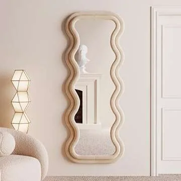 BOJOY Full Length Irregular Wavy Mirror 63"x24", Arched Floor Mirror Standing Hanging or Leaning Against Wall for Bedroom, Flannel Wrapped Wooden Frame -Milk Tea Color