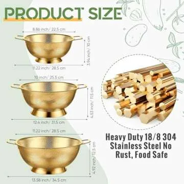 Bokon 3 Pcs Stainless Steel Colander Set Colander Bowl and Sieves 1/3/5 Quart Metal Mesh Strainer Net Basket with Handles Food Spaghetti Strainer for Kitchen Draining Pasta Rinsing(Gold)