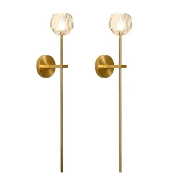 Show more Introducing the **BOKT Mid Century Modern Gold Crystal Wall Sconce Set**, a stunning addition to your home decor that effortlessly combines style, functionality, and elegance. These sconces feature a remarkable long tube design in a beautiful brushed brass finish, perfectly complemented by exquisite clear crystal lampshades. With their modern yet timeless appeal, these lighting fixtures illuminate and enhance the ambiance of any room, making them a perfect choice for those who want to elevate their living space.