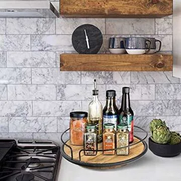 Show more Introducing a stunning and functional kitchen essential that transforms your dining experience! This exquisite turntable boasts a perfect 10” diameter and is expertly designed to accommodate various items such as condiments, spices, cans, and pantry supplies. Made from high-quality natural wood, it not only serves its purpose but also enhances your kitchen decor with its rustic farmhouse charm. Each piece is handmade, ensuring that it carries a unique character, truly making it a standout item in any home.