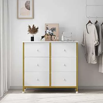 Show more Introducing the sophisticated and functional White Fabric Drawer Dresser, a perfect addition to any child's room or nursery. This versatile dresser not only serves as a practical storage solution but also enhances your decor with its elegant white and gold design. Crafted with a robust steel frame, the dresser stands tall with overall dimensions of 31.5'' x 11.8'' x 28.7'', making it suitable for compact spaces while providing ample storage. The drawer dimensions of 14.6'' x 11.8'' x 7.9'' allow each of the four fabric drawers to hold up to 11 lbs, ideal for toys, clothing, or essential baby items.