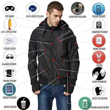 Show moreIntroducing the Bombax 10 Pockets Men Travel Jacket Flight Bomber Windbreaker Hoodie Coat, a revolutionary travel companion designed specifically for modern adventurers and jet-setters. Tailored from a premium blend of 80% cotton and 20% polyester, this jacket combines functionality with style. With 10 strategically placed pockets, you can keep all your travel essentials at your fingertips, making security checks and airport navigation a breeze. Whether you're on an eight-hour flight to Germany or exploring a colder climate, the jacket's lightweight design coupled with an ergonomic, detachable inflatable neck pillow ensures comfort and convenience throughout your adventures.