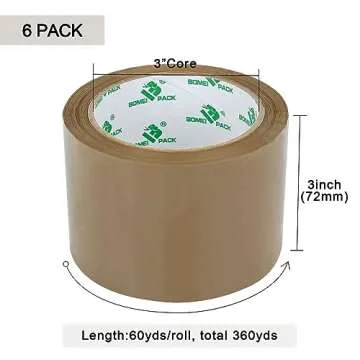 Show more The BOMEI PACK brown packing tape is a must-have for anyone looking to streamline their packing and shipping process. With a generous dimension of 3 inches in width and a robust thickness of 2.4 mils, this tape is designed to handle all your heavy-duty needs effortlessly. Each roll offers a substantial length of 60 yards, providing a total of 360 yards over 6 rolls. Perfectly crafted for standard 3-inch core tape dispensers, this tape saves time by allowing users to cover boxes in a single pass without the need for multiple applications.