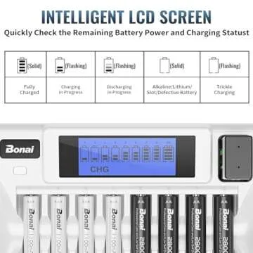 Show more The Bonai Multi-Channel Battery Charger is an innovative solution for anyone tired of dealing with dead batteries. This versatile charging station allows you to charge between 1 to 8 pieces of Ni-MH and Ni-CD AA and AAA rechargeable batteries, along with one Li-ion Ni-MH 9V rechargeable battery. With its state-of-the-art design, the device prioritizes efficiency and effectiveness, so you no longer have to worry about running out of power when you need it the most.