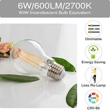 Illuminate your living space with the Boncoo Vintage LED Edison Bulb! This stylish and energy-efficient lighting solution delivers a warm 2700K soft white glow, ideal for creating a cozy ambiance in any room. Designed with a clear glass finish, these dimmable 6W A19 LED bulbs provide a spectacular vintage look while offering the energy-saving benefits of modern LED technology. Each bulb emits a brilliant 600 lumens, serving as the perfect 60W incandescent equivalent, ensuring that you achieve the same brightness...
