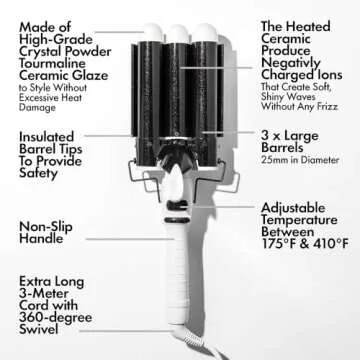 Introducing the BONDIBOOST Wave Wand Hair Curling Iron, your ultimate styling ally for effortlessly achieving stunning beach waves! Specially designed for all hair types, this innovative curling wand features 25 mm ceramic tourmaline barrels that offer a triple design for extra volume and long-lasting results. Whether you have straight, wavy, curly, or coily hair, this wand caters to your unique stylistic needs.