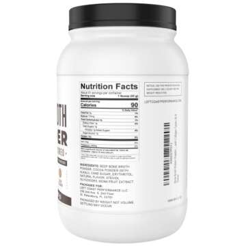 Show more Discover the transformative power of **Left Coast Performance's Chocolate Bone Broth Protein Powder**. This premium protein supplement brings you a unique blend of high-quality nutrients designed to enhance your health and well-being. Packed in an 80 oz jar (note: the jar will be half full due to settling, which is standard for protein powders), this product promises **42 servings of deliciousness and superior nutritional benefits**. Each serving delivers **16g of protein** and **13g of collagen**, derived from grass-fed sources, making it an excellent choice for anyone looking to up their protein intake while supporting gut health.