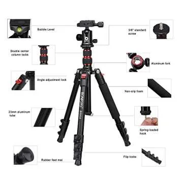 The innovative double telescoping center columns enhance portability when folded, making this tripod compact and convenient for travel. You'll appreciate the distinct red highlights at the knobs and buttons, which add a touch of flair to its robust design. The inverted central axis is perfect for macro photography, while the ball head provides exceptional tilt and swivel motion with a full 360° movement capability.