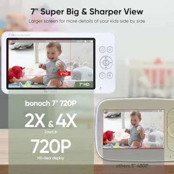 Introducing the bonoch MegaView Baby Monitor, a revolutionary solution for parents with twins or close siblings. With two high-definition cameras feeding into a stunning 7" 720P HD split screen, this monitor allows you to effortlessly oversee both babies at once. Experience unparalleled clarity as the display delivers sharp images and exceptional detail, ensuring you can respond at a moment’s notice to your little ones. Transitioning between single-screen and split-screen...