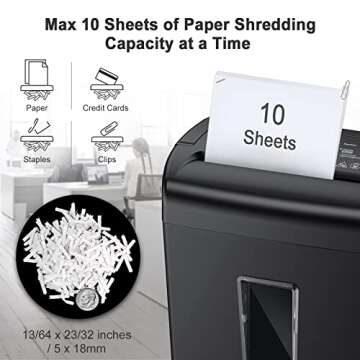 Show more Introducing the Bonsaii 10-Sheet Paper Shredder, your ultimate companion for maintaining privacy and keeping your home office organized. This robust and efficient paper shredder is designed to handle your shredding needs effectively, boasting a remarkable 10 sheets shredding capacity for letter-sized paper (75g/m²). The advanced cross-cut technology ensures that your sensitive documents are reduced to tiny pieces measuring 13/64 x 1-37/64 inches (5x40mm), providing utmost security against identity theft. Not just for paper, this versatile shredder can also efficiently destroy junk mail, destroy staples, and even shred credit cards (one at a time), making it a comprehensive solution for your shredding needs at home.
