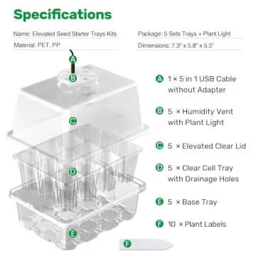 Bonviee 5 Packs Seed Starter Tray with Grow Light, Elevated Seedling Starter Trays Kits with Adjustable Humidity Domes and Clear Cell Tray, 12 Full Spectrum led lamp Beads for Plants Indoor-Clear