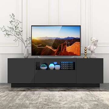 Show moreIntroducing the **Bonzy Home TV Stand with LED Lights** – a perfect blend of modern aesthetics and practicality that will enhance your living room setup. This stunning TV stand measures **63”L x 16.5”W x 20”H**, boasting a sleek gloss black finish that complements any decor. With ample storage space featuring **1 open shelf**, **1 flat drawer**, and **2 smooth sliding doors**, you can easily organize your living room essentials, gaming consoles, or media devices while keeping your space clutter-free. Ideal for TVs up to **70 inches** wide, this stand can support a maximum weight of **120 lbs**, ensuring reliability and stability for your entertainment needs.