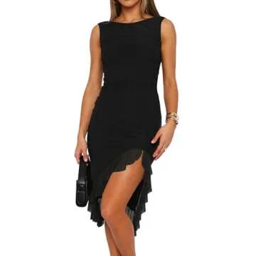 BORIFLORS Women's Sexy Ruched Bodycon Midi Dresses Elegant Sleeveless Backless Ruffle Hem Cocktail Party Tank Dress, Medium, Black