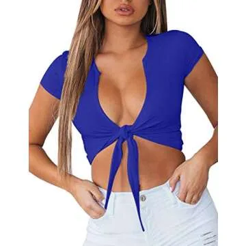 BORIFLORS Women's Sexy Tie Up Crop Top Short Sleeve Deep V Neck Casual Basic T Shirt,Medium,Royal Blue