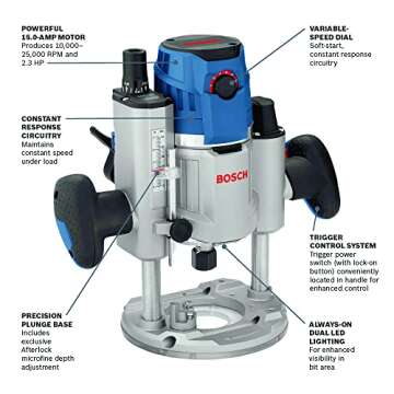 In a sea of plunge routers, the BOSCH MRP23EVS sets itself apart with its 15 Amp motor and advanced features such as microfine depth adjustment and LED lighting, making it more versatile than many competitors. Other routers may lack the Constant Response circuitry providing steadiness during cuts, while the exceptional build and ergonomic considerations of this router guarantee user comfort during extensive use. While alternatives may cast a lower price tag, they often compromise on essential features like durability, precision, and overall user experience.